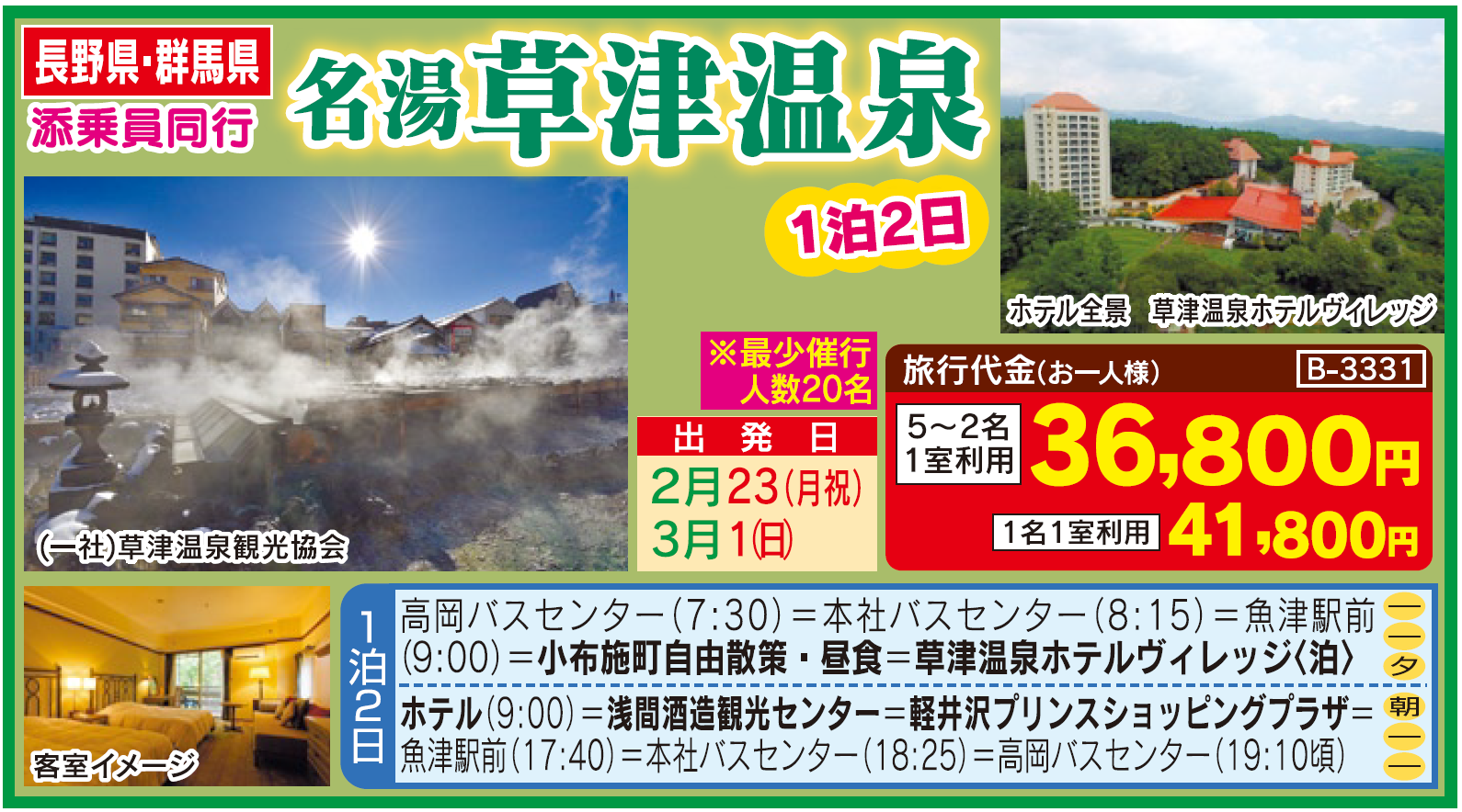 B3331【長野群馬】名湯草津温泉1泊2日