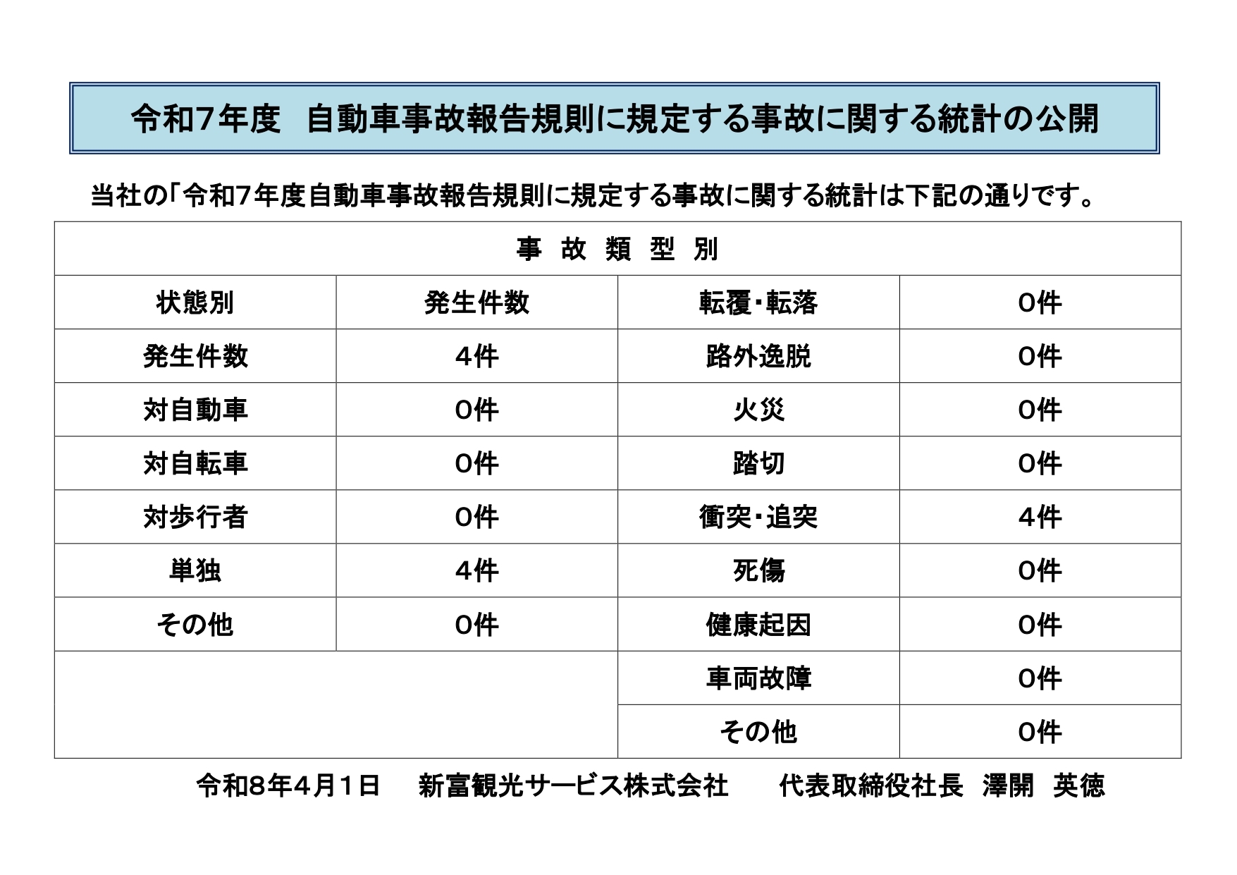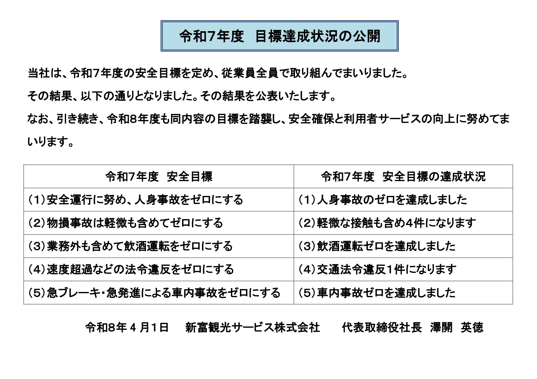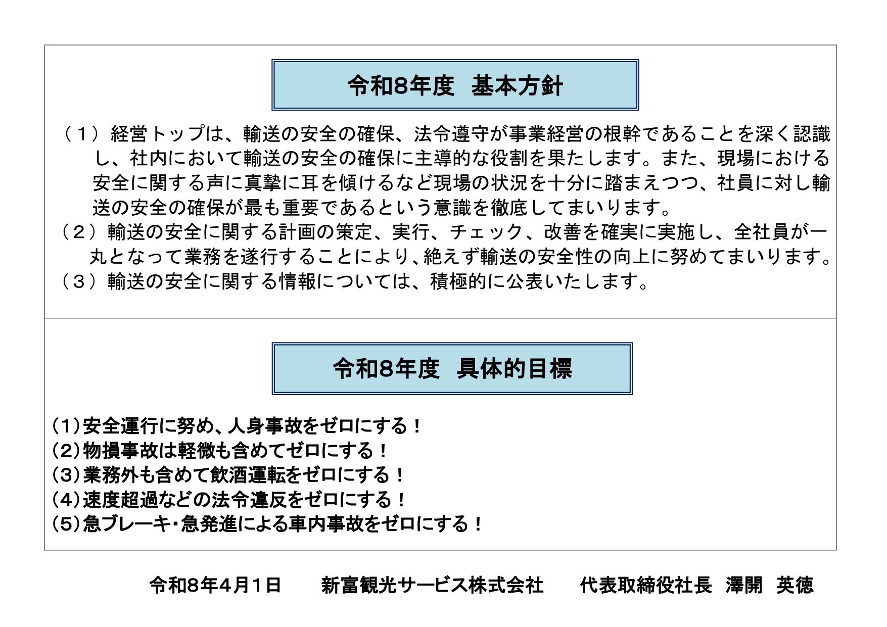 新富観光サービス株式会社は、輸送の安全確保が旅客自動車運送事業の社会的使命と深く認識し、全社員に輸送の安全の確保が最も重要であるという意識の徹底を図り、安全マネジメント体制の維持と継続的な改善に努めるため、次のとおり安全方針を定めます。
